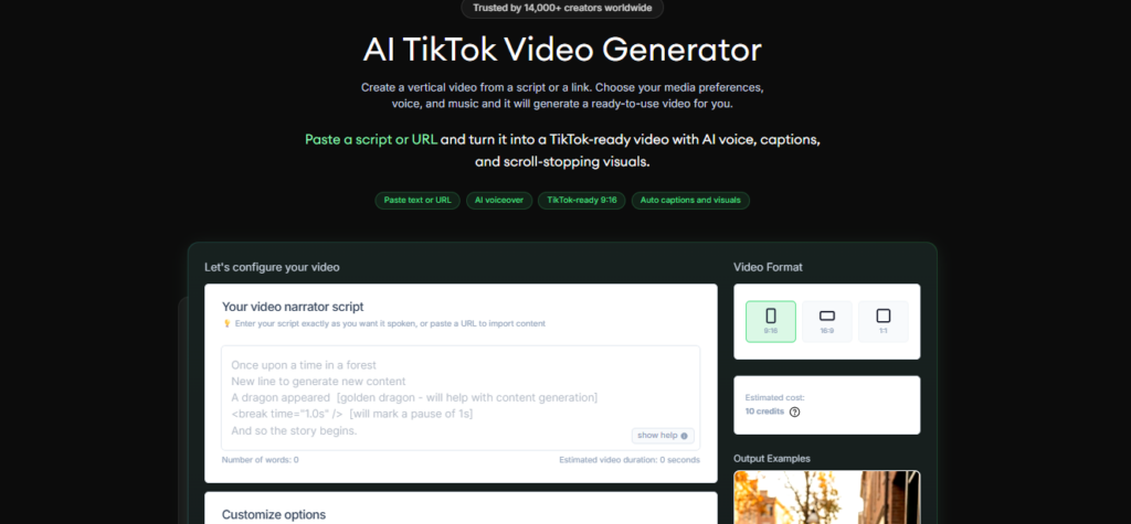 The AI TikTok Video Generator by revid.ai is an incredibly efficient tool that can transform even the most basic text script or URL into a complete, TikTok-ready video in a matter of seconds. It can independently create eye-catching vertical 9:16 content featuring AI voiceovers, auto captions, and lively visuals that have been specifically designed for high audience retention. In addition to selecting from other media types such as AI-generated video clips, moving AI images, stock footage, or their own uploaded content, users also get customizable voice and background music options.