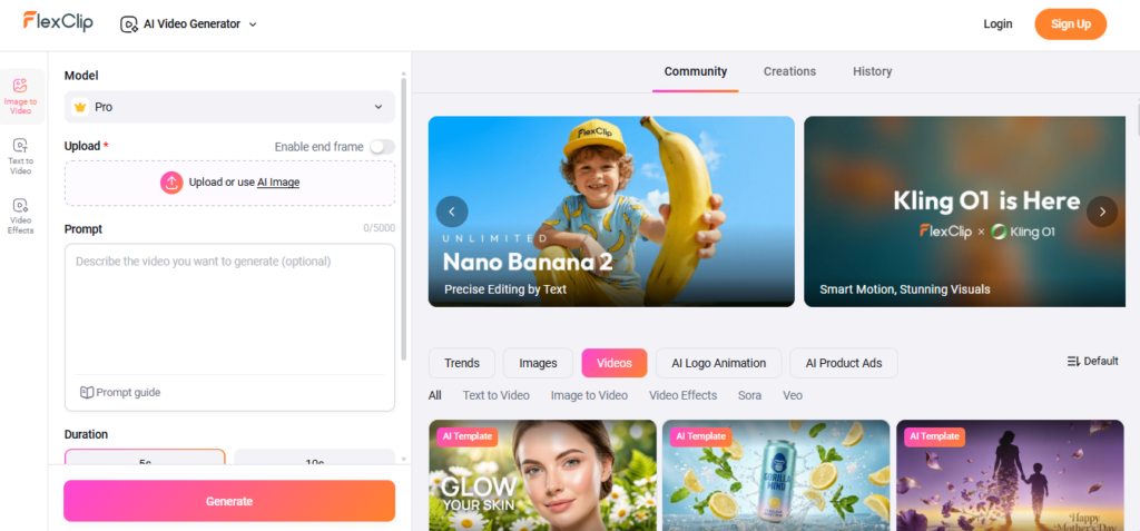FlexClip is a simple AI video generator for TikTok from text, pictures, and blog URLs. Text-to-Video, Image-to-Video, and URL-to-Video modes make a short video quickly. Its AI script generator removes creativity blocks by quickly creating high-quality screenplays. FlexClip provides accessibility and social engagement with auto-subtitles.